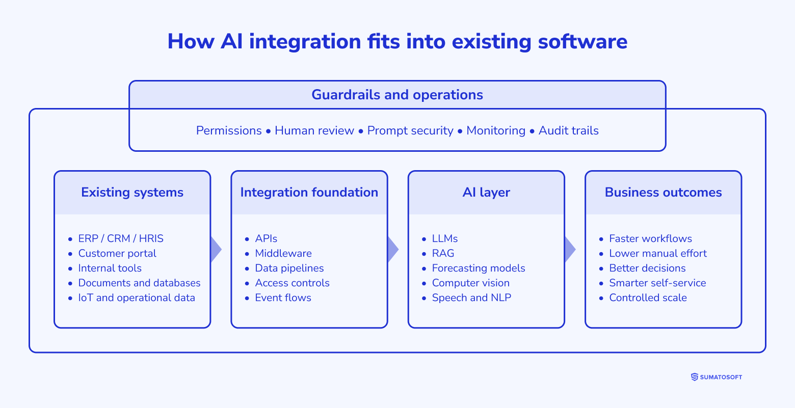 At SumatoSoft, AI integration starts with the system it has to work inside. We review the application logic, data flows, APIs, access rules, and performance requirements, then strengthen the foundation where needed before adding the AI layer. This helps us adapt the solution to different project types and integrate AI in a way that aligns with the software, workflow, and the level of control the business needs.